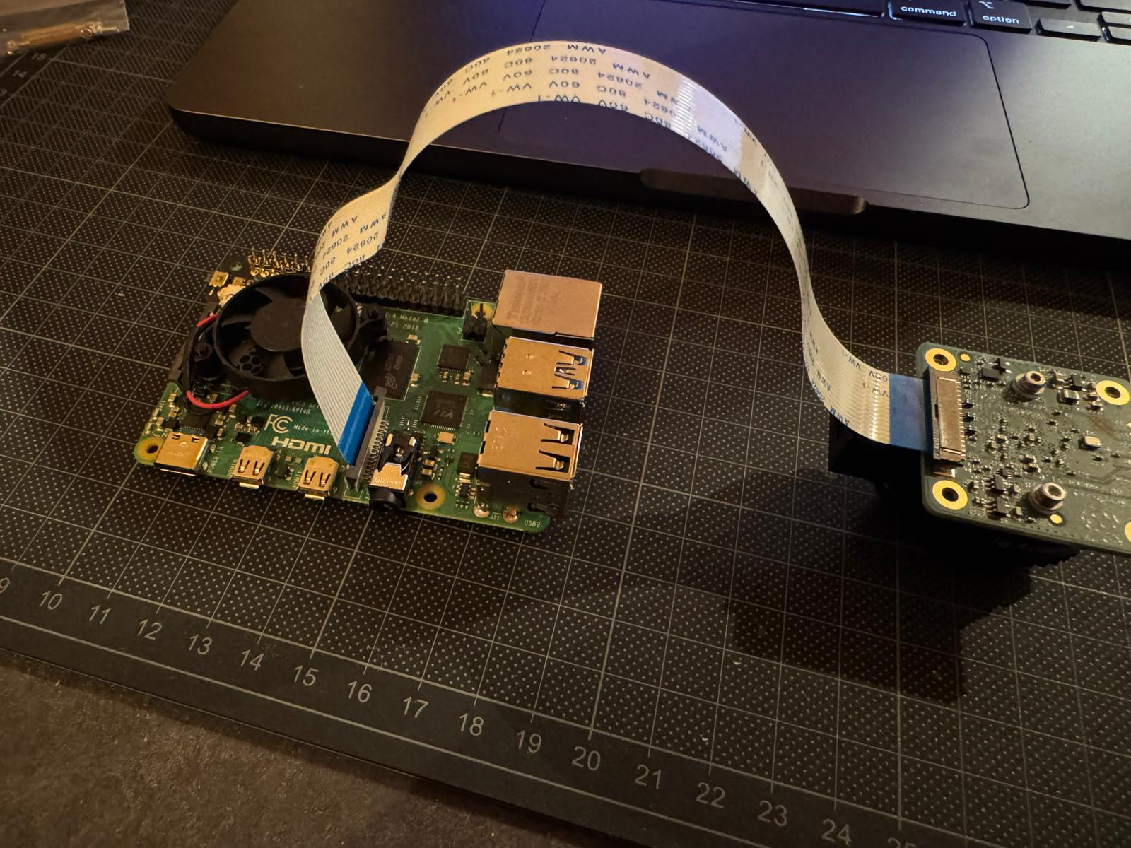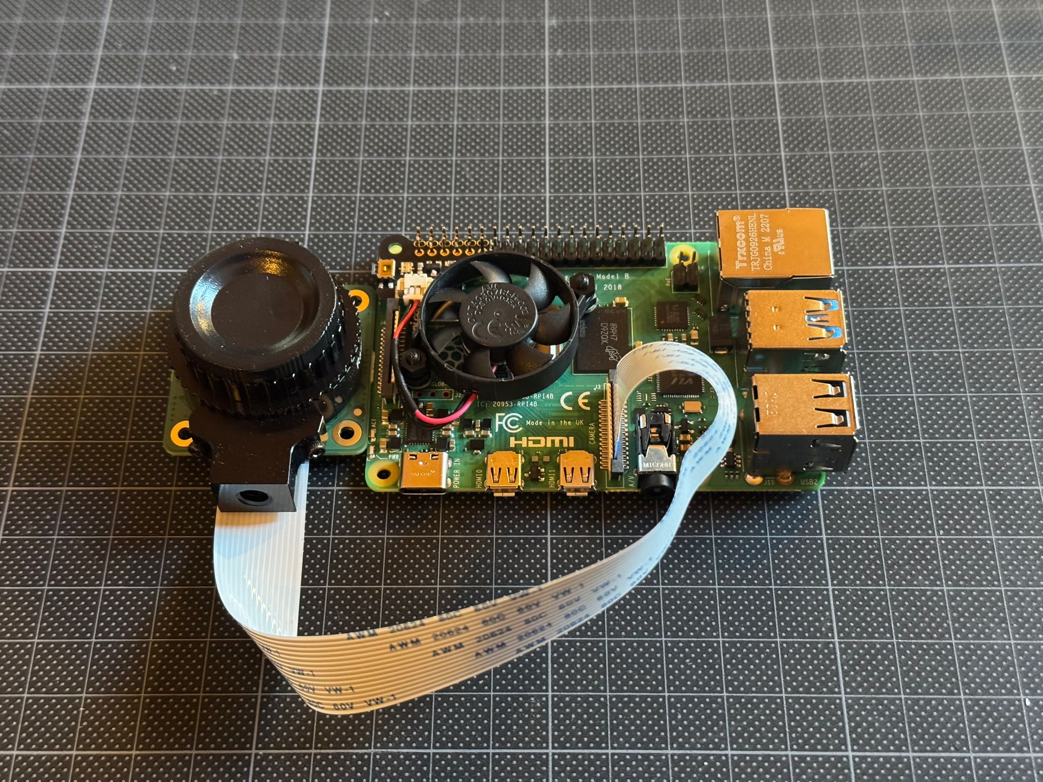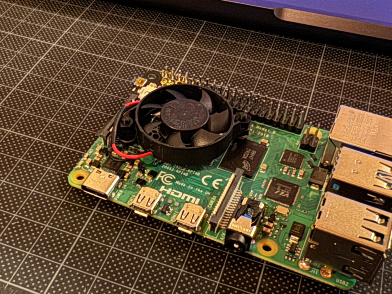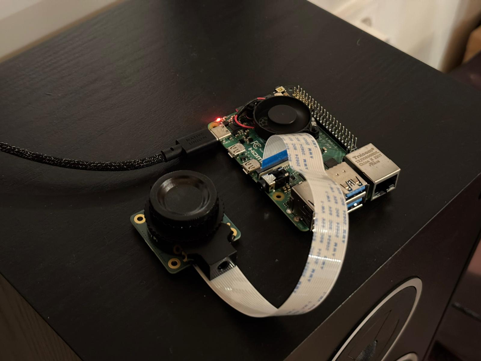 Nu de camera, ventilator en SD-kaart zijn gemonteerd kan hij middels een USB-C kabel en telefoonlader blokje van spanning worden voorzien en kunnen we hem voor het eerst opstarten. Uiteindelijk zal ik hem via PoE van stroom voorzien, maar dat is weer een paar stappen verder.